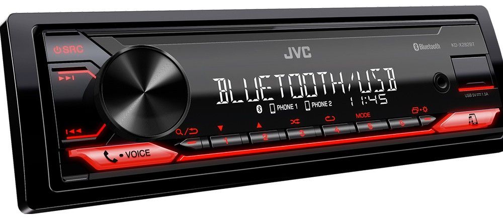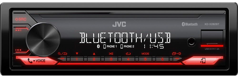 Autorádio s USB přehrává MP3/WMA/WAV/FLAC. Má červené podsvícení tlačítek.