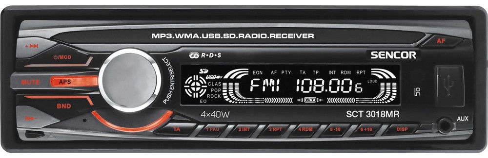 Autorádio s USB/SD/MMC přehrává MP3/WMA. Má červené podsvícení tlačítek.