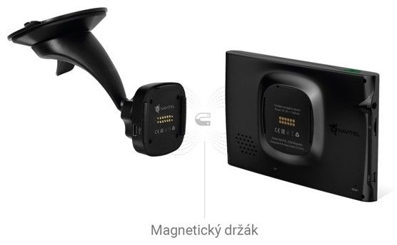 Hlavní výhoda modelu NAVITEL E500 MAGNETIC je revoluční magnetický držák s nepřetržitým napájením. Držák se přísavkou připevní na čelní sklo automobilu a prostřednictvím adaptéru do zapalování je zařízení napájeno. Vše je samozřejmě součástí balení.