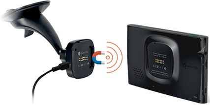 Klíčovou výhodou NAVITEL E500 MAGNETIC je revoluční magnetický držák s nepřetržitým napájením. Základní držák s přísavkou, který je součástí balení, se pevně připevní k čelnímu sklu automobilu. Přes USB port je připojen k napájení automobilu prostřednictvím nabíječky do auta NAVITEL, která je také součástí balení.
