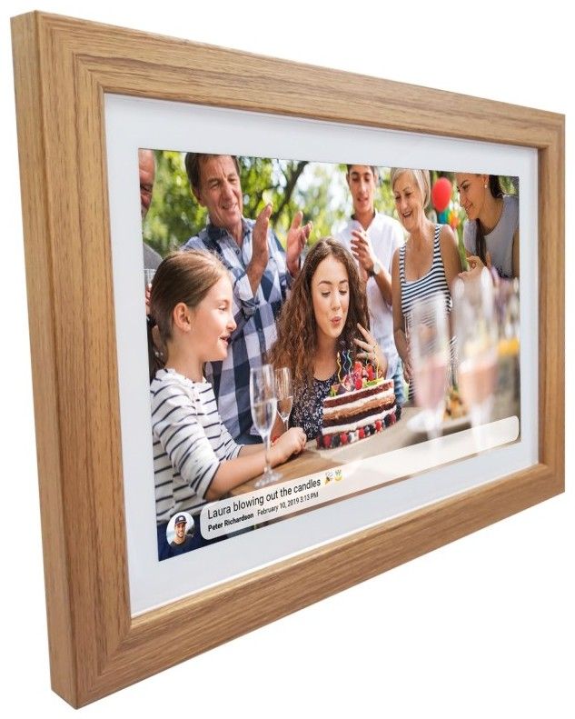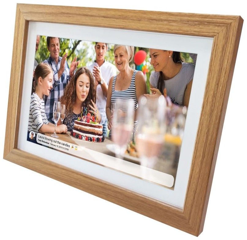 Digitální Wi-Fi fotorámeček má displej 10,1" IPS, software FRAMEO, 16 GB interní úložiště, slot pro MicroSD kartu max. 32 GB a možnost doplnění textu k obrázkům.