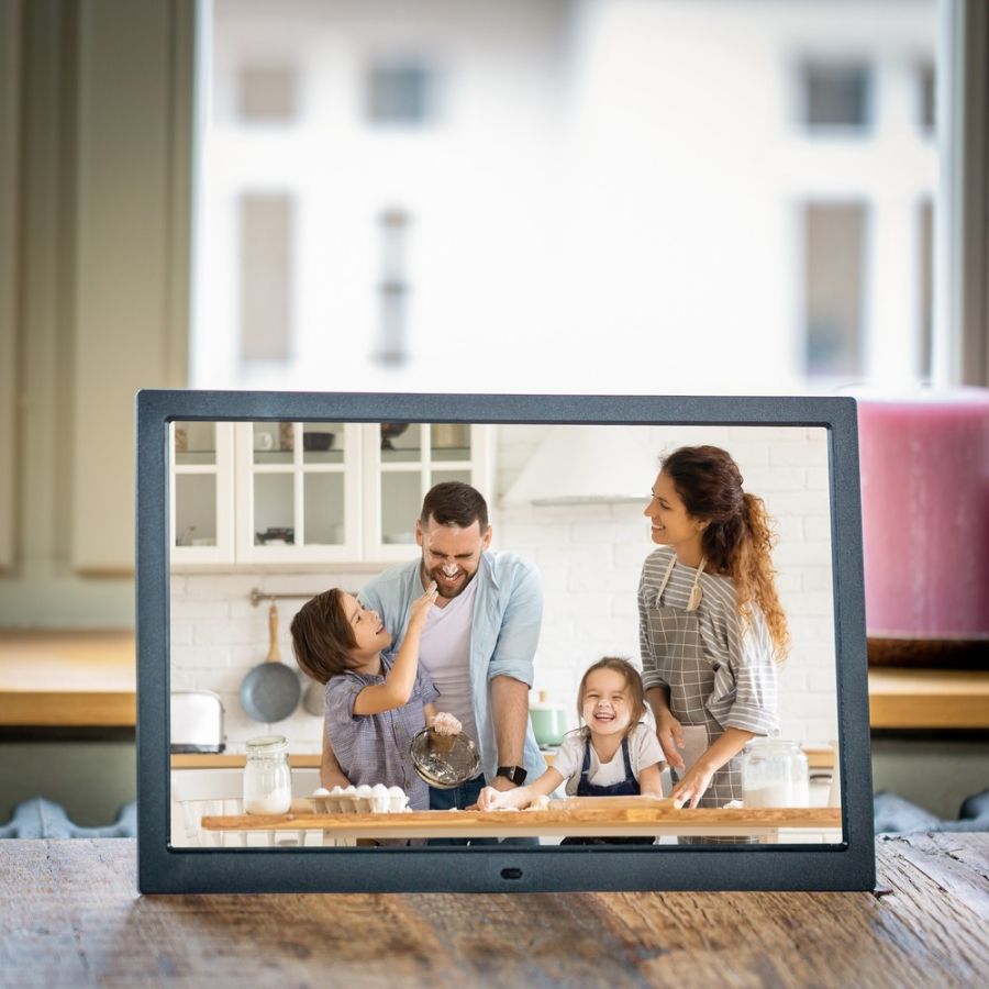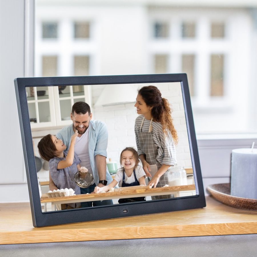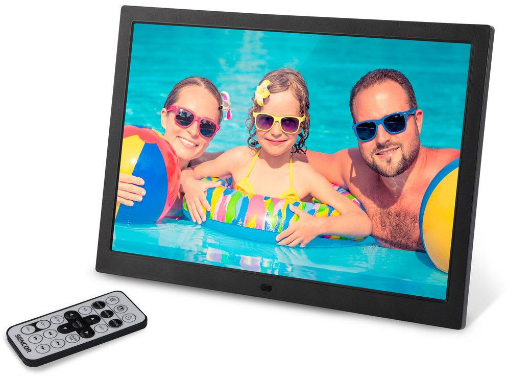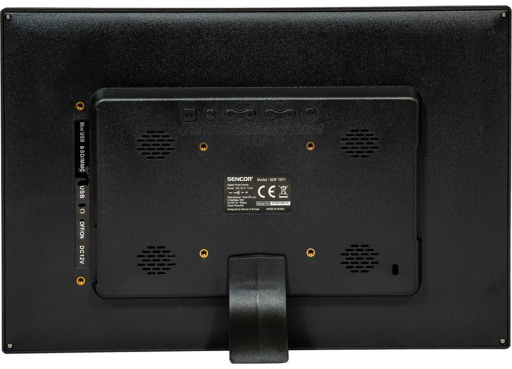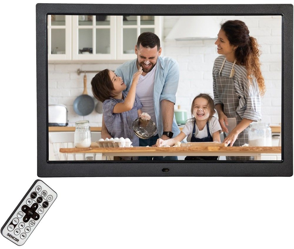 Digitální fotorámeček má displej 15,4" (39 cm) 16:9 TFT LED, čtečku karet (SD/SDHC/MMC) a dálkové ovládání.
