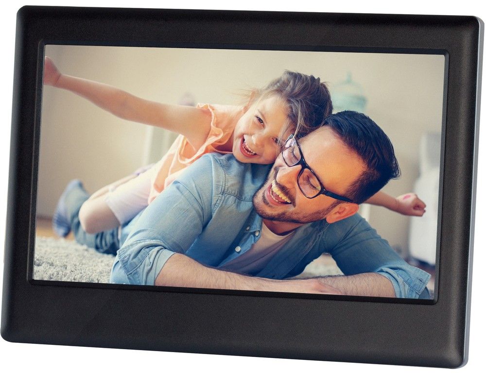 Digitální fotorámeček má 7-palcový (17,8 cm) 16:9 LCD displej, postupné promítání obrázků a čtečku na SD/SDHC/MMC/MS karty.