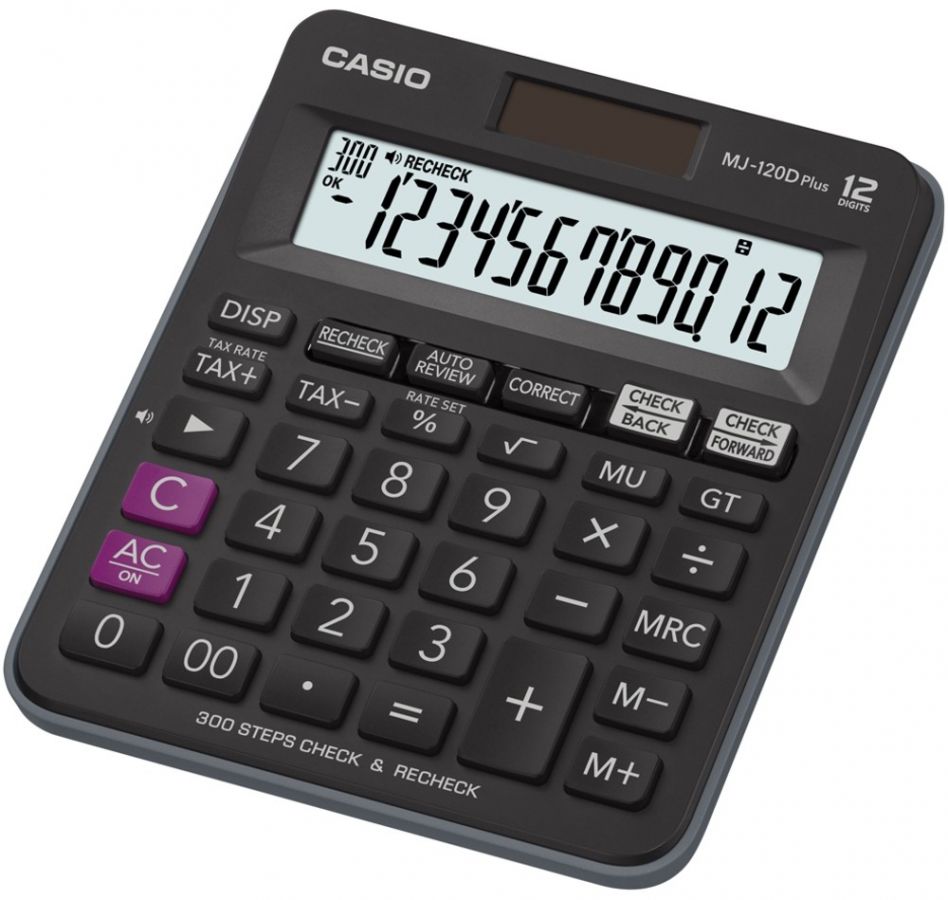 Kalkulačka s extra velkým 12-ti místným LCD displejem. S výpočtem DPH, procent a kontrolou 300 kroků výpočtu. Má opakovanou kontrolu se zvukovou asistencí, opravné tlačítko, celkový součet GT, marži a odmocninu.