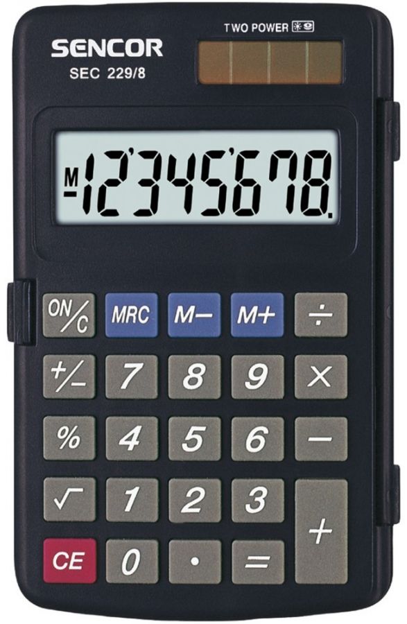 Kalkulačka s 8-mi místným LCD displejem, nezávislou pamětí a výpočtem odmocnin a procent.