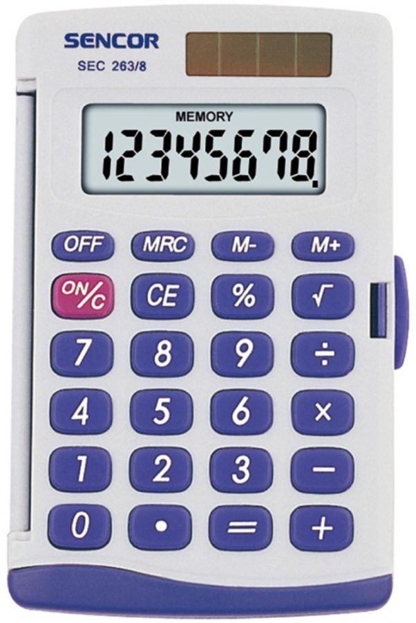 Kalkulačka s 8-mi místným LCD displejem, nezávislou pamětí a výpočtem odmocnin a procent.