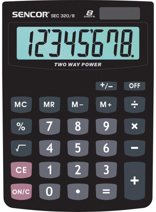 Kalkulačka s 8-mi místným LCD displejem, nezávislou pamětí a výpočtem odmocnin a procent.