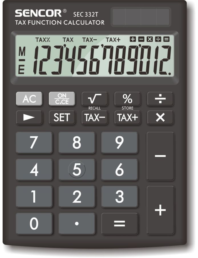 Kalkulačka s 12-ti místným displejem, výpočtem odmocnin a procent.