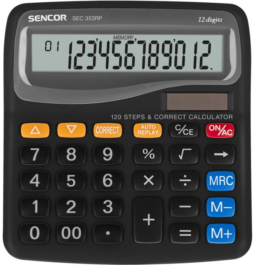 Kalkulačka s 12-ti místným displejem, nezávislou pamětí a výpočtem odmocnin a procent.
