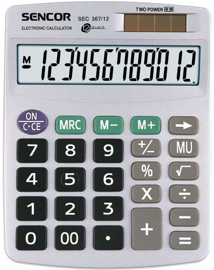 Kalkulačka s 12-ti místným LCD displejem, nezávislou pamětí a výpočtem odmocnin a procent.