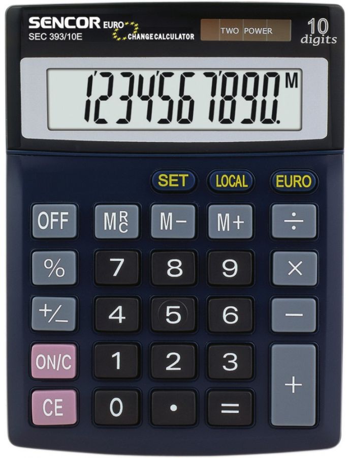 Kalkulačka s 10-ti místným displejem, nezávislou pamětí a výpočtem zisku a procent.