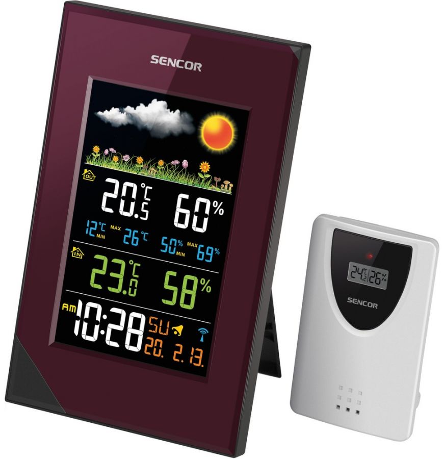Meteorologická stanice má hodiny řízené DCF signálem, předpověď počasí a vnitřní a venkovní teplotu a vlhkost.