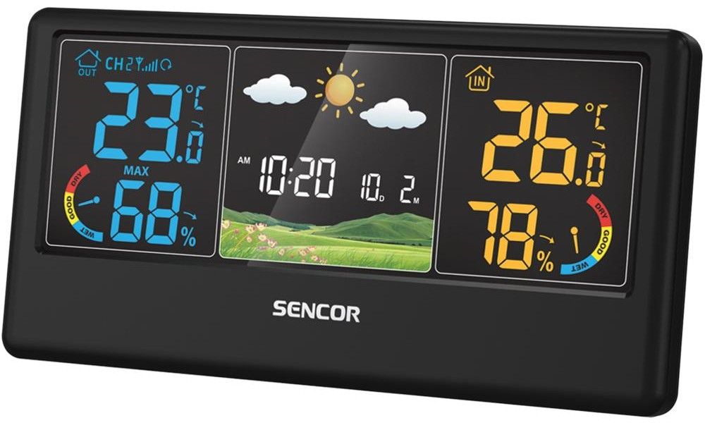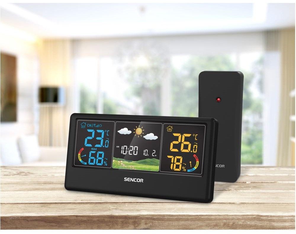 Meteorologická stanice s ikonou předpovědi počasí (slunečno, oblačno, oblačno, déšť, sněžení), vnitřním a venkovním měřením teploty a vlhkosti.