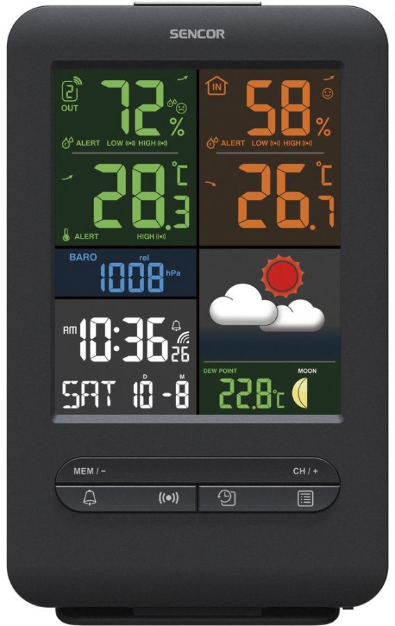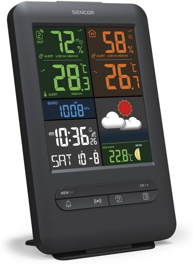 Meteorologická stanice má ikonu předpovědi počasí (slunečno, oblačno, zataženo, déšť, sněžení), barevný displej s úhlopříčkou 5,4" (13,8 cm), venkovní senzor součástí balení.