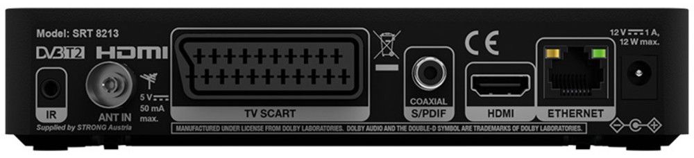 - Připojení: IR (volitelné příslušenství), ANT IN, HDMI, SCART, S/PDIF koaxiální, Ethernet, vypínač napájení