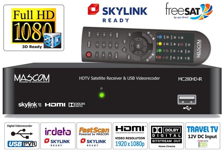 HD satelitní přijímač s dekodérem pro příjem Skylink a Freesat. Má vestavěný USB viderorekordér a funkci FastScan pro automatickou aktualizaci programů Skylink bez přelaďování.