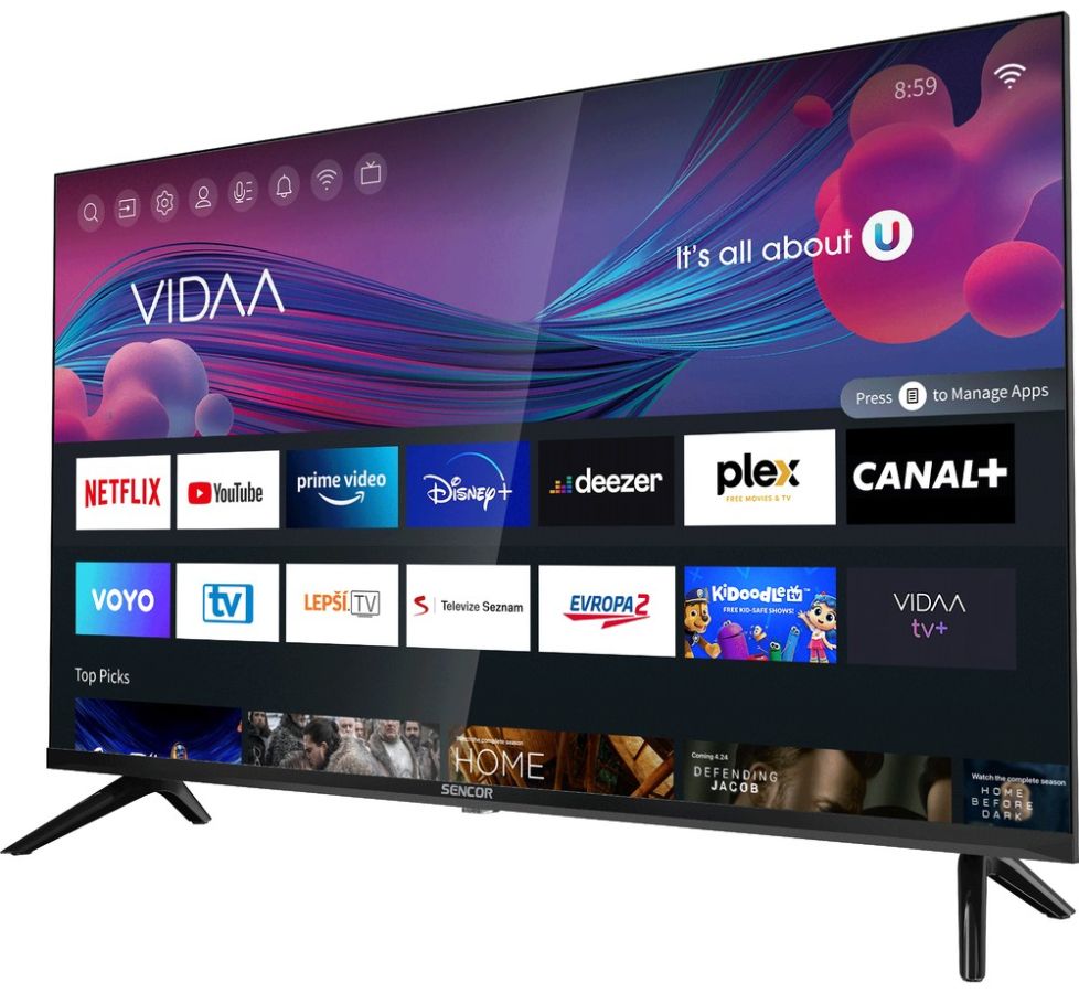 V televizorech SENCOR s operačním systémem VIDAA nechybí světové aplikace NETFLIX, DISNEY+, YOUTUBE, AMAZON PRIME a lokální VOYO, SledováníTV, Lepší.TV, Televize Seznam, Pohádky, ANTIK TV.