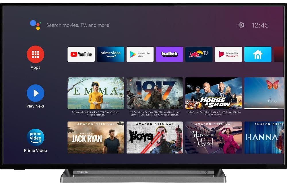 Televize ANDROID LED, úhlopříčka 109 cm, UHD, DVB-T2/S2/C, H.265/HEVC, 3x HDMI, 2x USB, USB nahrávání, WiFi, HbbTV, Netflix, Bluetooth, Android TV, VESA 100 x 100 mm, repro 20W, energetická třída F