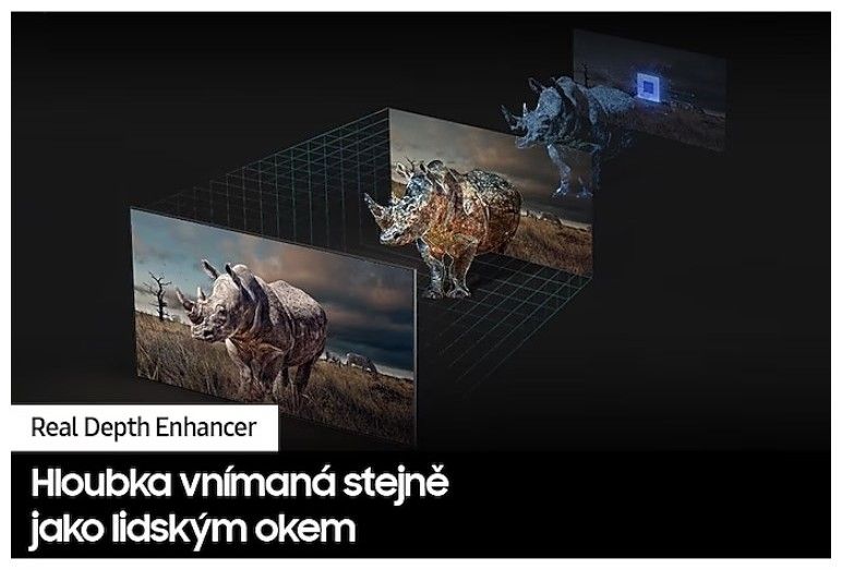 Pokročilá funkce Real Depth Enhancer napodobuje způsob, jakým lidské oko zpracovává hloubku zvýšením kontrastu na objektu v popředí. Takže když například sledujete dokument o přírodě, zvýrazní sloní vrásky a pozadí nechává takové, jaké je – stejně jako lidský zrak.