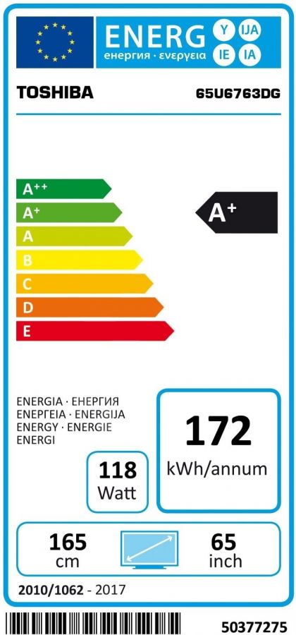 Televize SMART LED, úhlopříčka 165cm, 4K Ultra HD 3840x2160, TPQ 1000, MEMC, 4K Ultra HD Upscaler, DVB-T2/S2/C, H.265/HEVC, 4x HDMI, 3x USB, SCART, VGA, CI+, LAN, WiFi, Bluetooth, HbbTV, NETFLIX, YouTube, USB nahrávání, Timeshift, Web prohlížeč, Miracast, Toshiba Smart portál, hotelový mód, USB klonování, VESA, repro 2x 12W, Energetická třída A+