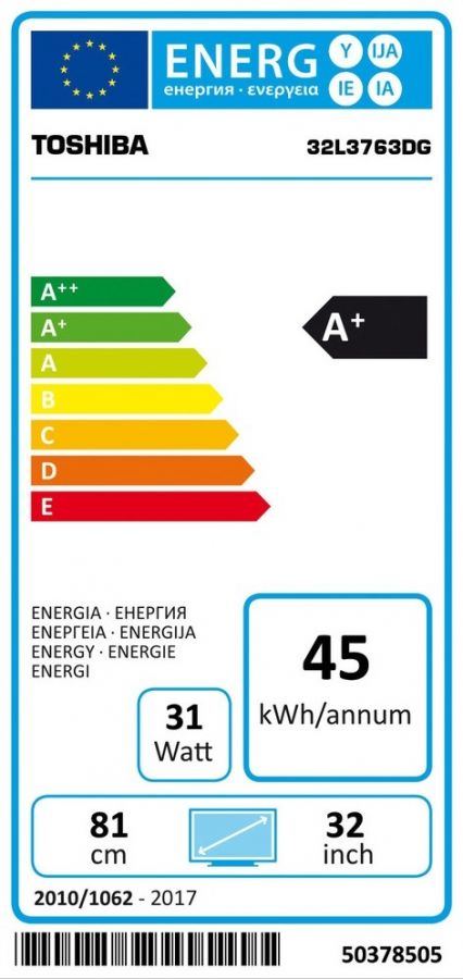 Televize SMART LED, úhlopříčka 81 cm, Full HD, TPQ 700, DVB-T2/S2/C, H.265/HEVC, 3x HDMI, 2x USB, SCART, VGA, CI+, LAN, WiFi, HbbTV, NETFLIX, YouTube, USB nahrávání, Timeshift, Web prohlížeč, Miracast, Toshiba Smart portál, hotelový mód, USB klonování, VESA, repro 2x 6W, Energetická třída A+