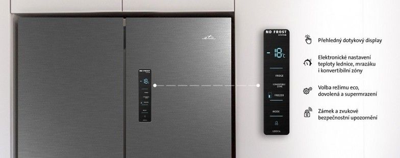 Americká lednice ETA je jako stvořená pro rodiny. Chladicí část lednice vám nabídne velkorysý objem 343 litrů, kam pohodlně schováte celý týdenní nákup. Uvnitř najdete skleněné police a transparentní šuplíky, které vám pomohou s organizací lednice. Nechybí zde ani praktické tvořítko na led. Vnitřní LED osvětlení je úspornější a nevytváří zbytečné teplo.