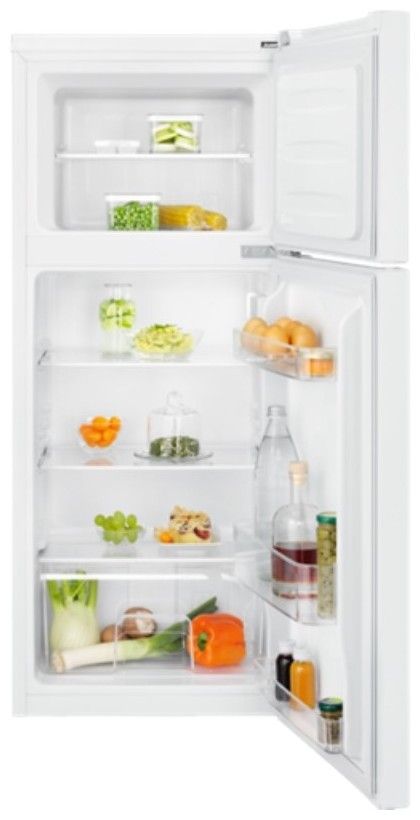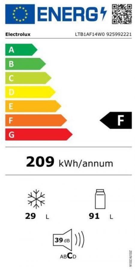 Kombinovaná chladnička s energetickou třídou F o celkovém užitném objemu 120 l. Objem chladničky 91 l a objem mrazničky 29 l.