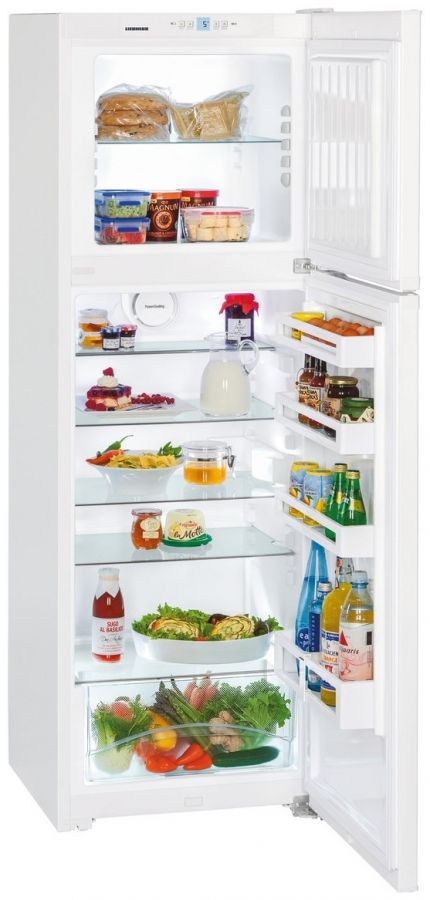 Chladnička s mrazákem nahoře o celkovém užitném objemu 307 l. Objem chladničky 232 a objem mrazničky 75 l.