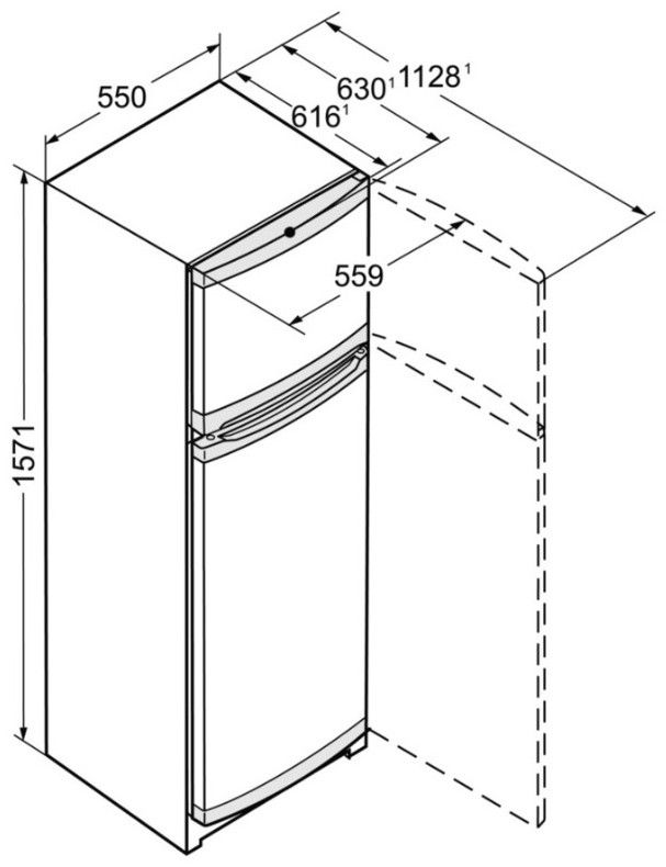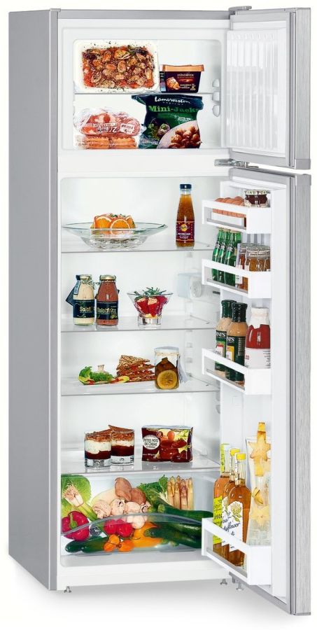 Chladnička s mrazákem nahoře o celkovém užitném objem 270 l. Objem chladničky 219 l a objem mrazničky 52 l.