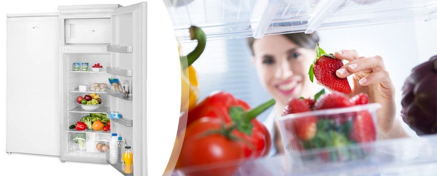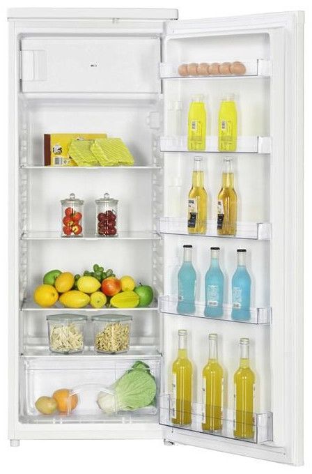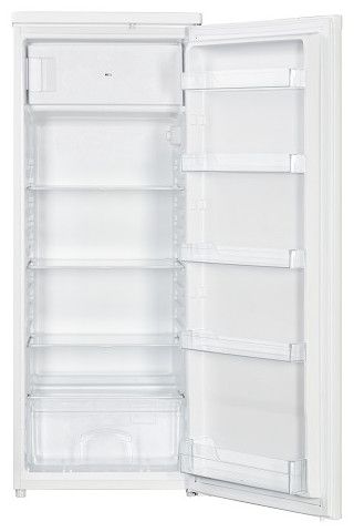 Chladnička s mrazákem s energetickou třídou F o celkovém užitném objemu 218 l. Objem chladničky 204 l a objem mrazničky 14 l.