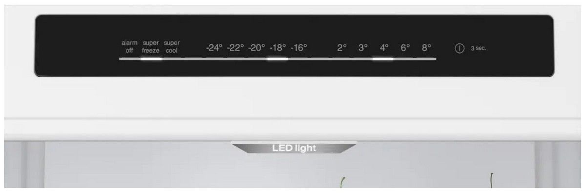 - Druh ovládacích a signalizačních prvků: spínač super mrazení, spínač super chlazení, ukazat. teploty mraz. prostoru, ukazat. teploty chlad. prostoru, upozornění při poruše v mraz. oddílu, upozornění při poruše spotřebiče, upozornění v případě, že dveře jsou otevřené