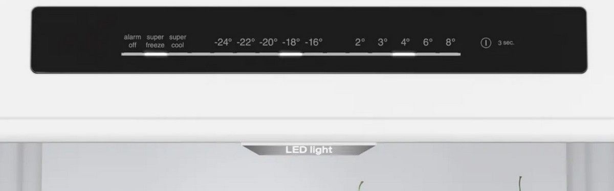 - Ovládací prvky: Spínač supermrazení, Spínač supechlazení, Ukazat. teploty mraz. prostoru, Ukazat. teploty chlad.prostoru, Upozornění pro mrazírenské, Upozornění pro zmrazení důsledku nefunkčnosti, Upozornění: v případě, že dveře jsou otevřené