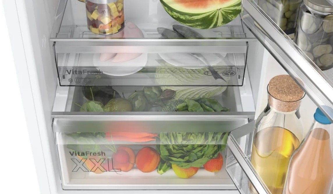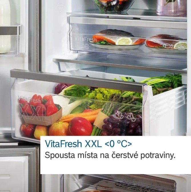 Prostorný systém VitaFresh XXL & nabízí ideální prostředí pro skladování vašich čerstvých potravin. Udržuje teplotu blízko 0 °C pro maso a ryby a k dispozici je zásuvka s řízeným klimatem, která uchová vaše ovoce a zeleninu skutečně čerstvé.