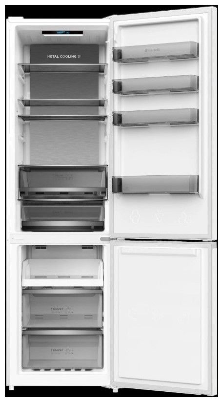 Brandt BFC2066AW je vybavena řadou inteligentních funkcí, které vám usnadní život. Funkce Super chlazení a Super mrazení rychle sníží teplotu pro rychlé uchování potravin. Pomocí funkce ECO bude chladnička fungovat s lepší účinností díky lepšímu přednastavenému teplotnímu rozsahu mezi teplotou v chladničce a mrazničce. Teplota v chladničce bude nastavena na 5°C a v chladničce na -18°C. Díky dětskému zámku ovládacího panelu a alarmu otevřených dveří je zajištěna bezpečnost vašich potravin i dětí.
