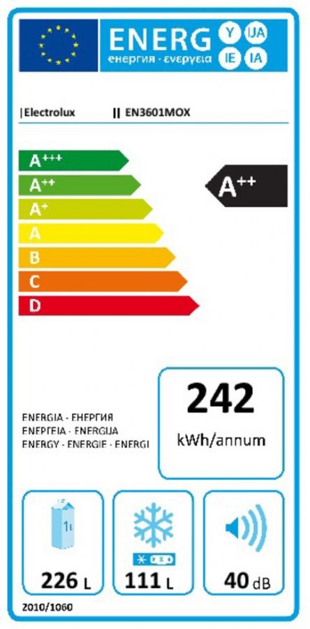 Kombinovaná chladnička s energetickou třídou A++ o celkovém užitném objemu 337 l. Objem chladničky 226 l a objem mrazničky 111 l.
