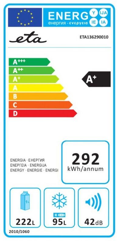 Kombinovaná chladnička s energetickou třídou A+ o celkovém užitném objemu 317 l. Objem chladničky 222 l a objem mrazničky 95 l.