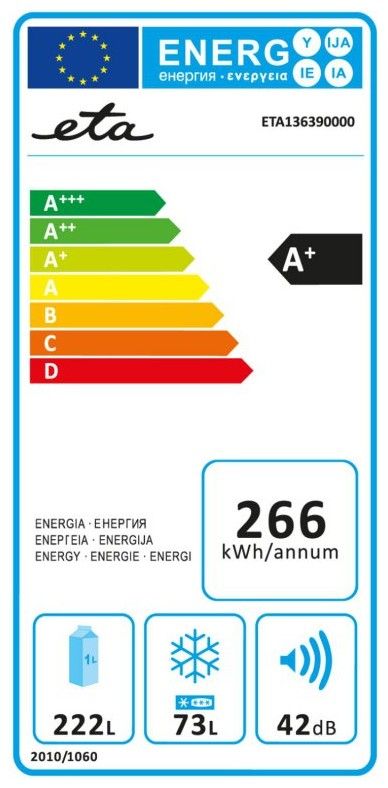 Kombinovaná chladnička s energetickou třídou A+ o celkovém užitném objemu 295 l. Objem chladničky 222 l a objem mrazničky 73 l.