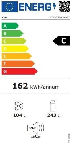 Moderní a praktická kombinovaná chladnička ETA bude královnou každé kuchyně. Se svým velkorysým celkovým objemem 347 litrů se pohodlně postará o jídlo celé rodiny. Svou spotřebou však do rodinného rozpočtu nezasáhne. Energeticky je chladnička zařazena do úsporné třídy C.