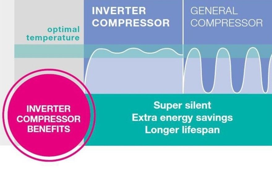 Invertorové kompresory jsou tišší, odolnější a spotřebovávají méně energie ve srovnání s konvenčním kompresorem. Lepší a rychlejší přizpůsobení se změnám teploty uvnitř chladničky, například při otevření dvířek, což znamená menší kolísání teploty a lepší podmínky skladování vašeho jídla.