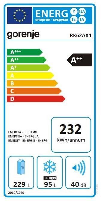 Kombinovaná chladnička s energetickou třídou A++ o celkovém užitném objemu 324 l. Objem chladničky 229 l a objem mrazničky 95 l.