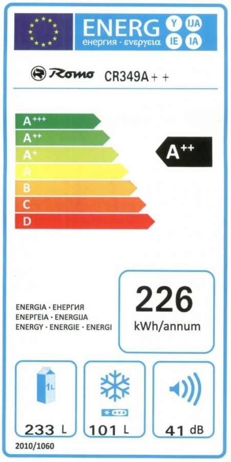 Kombinovaná chladnička s energetickou třídou A++ o celkovém užitném objemu 334 l. Objem chladničky 233 l a objem mrazničky 101 l.
