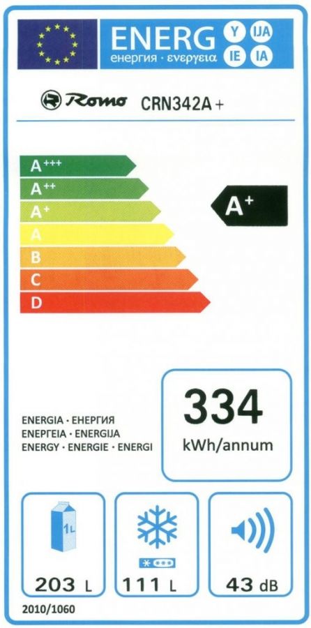 Kombinovaná chladnička s energetickou třídou A+ o celkovém užitném objemu 314 l. Objem chladničky 203 l a objem mrazničky 111 l.