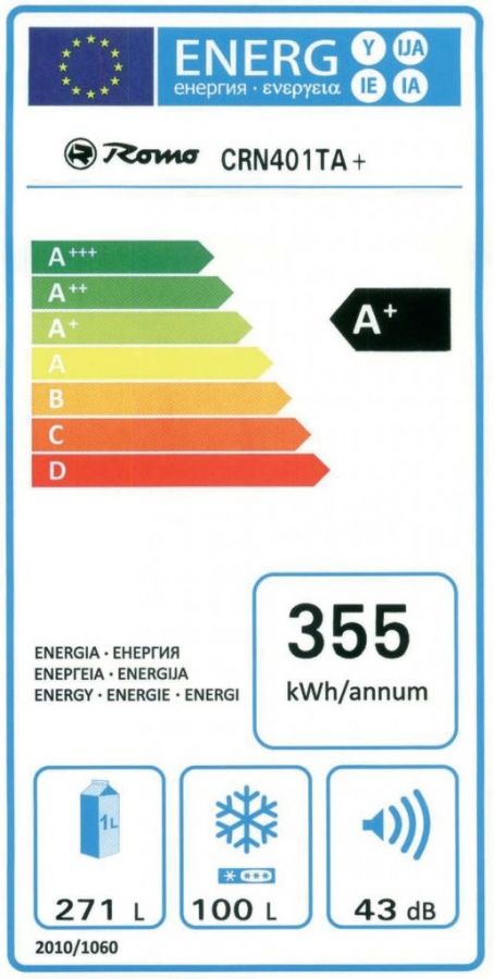 Kombinovaná chladnička s energetickou třídou A+ o celkovém užitném objemu 371 l. Objem chladničky 271 l a objem mrazničky 100 l.
