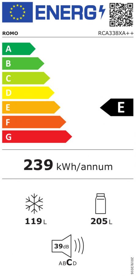 Kombinovaná chladnička s energetickou třídou E o celkovém užitném objemu 324 l. Objem chladničky 205 l a objem mrazničky 119 l.