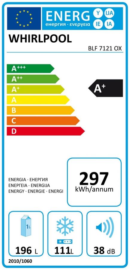 Kombinovaná chladnička s energetickou třídou A+ o celkovém užitném objemu 307 l. Objem chladničky 196 l a objem mrazničky 111 l.