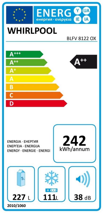 Využitelný objem chladničky v energetické třídě A++ je rozdělen na 227 l pro chladicí a 111 l pro mrazicí část.