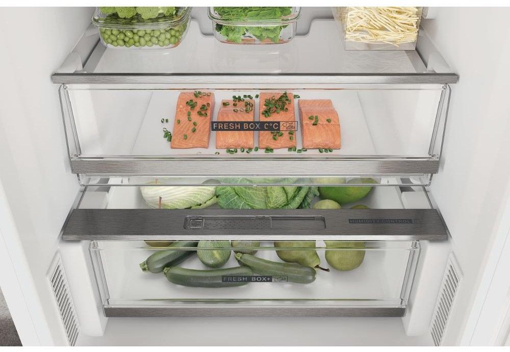 Ovoce a zelenina vydrží čerstvé až 15 dní*. Zásuvka s integrovaným posuvným ovládáním pro regulaci vlhkosti, které umožňuje uchovávat ovoce a zeleninu čerstvé až 15 dní*.