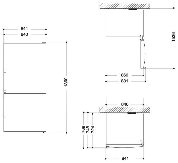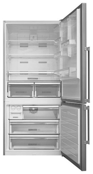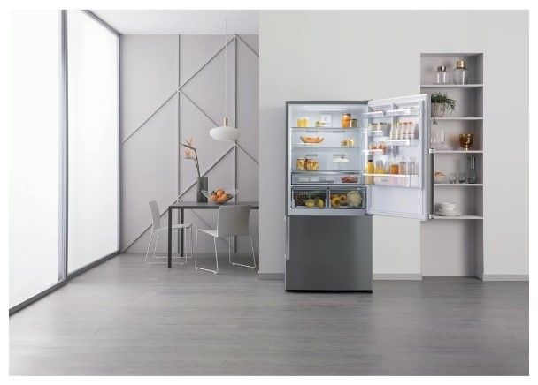 Kombinovaná chladnička o celkovém užitném objemu 588 l. Objem chladničky 407 l a objem mrazničky 181 l.
