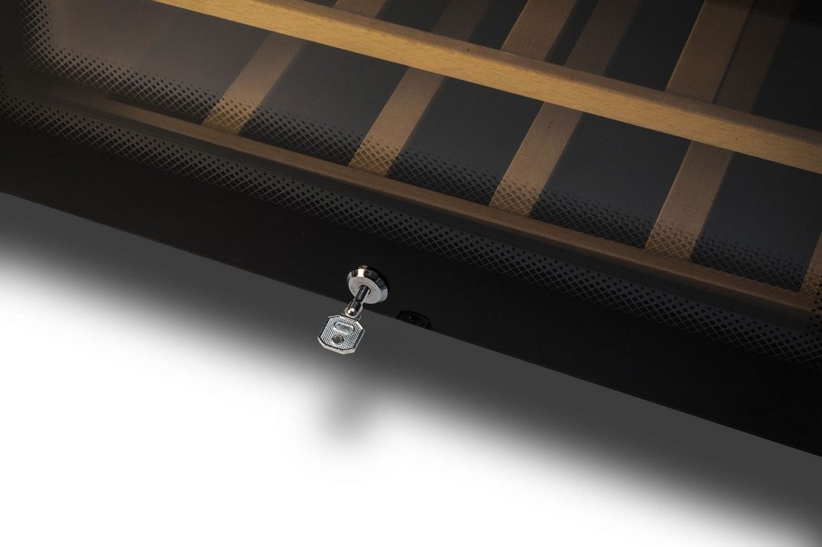 - Bezpečnost a komfort: Vinotéka je vybavena zámkem a alarmem otevřených dveří, což zajišťuje maximální ochranu vašich lahví.