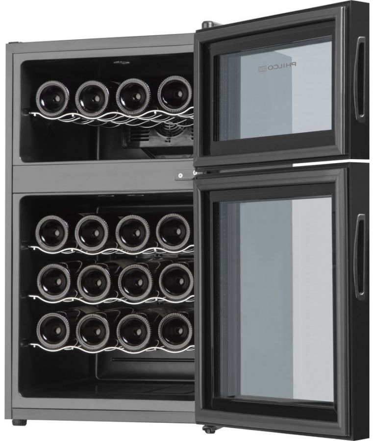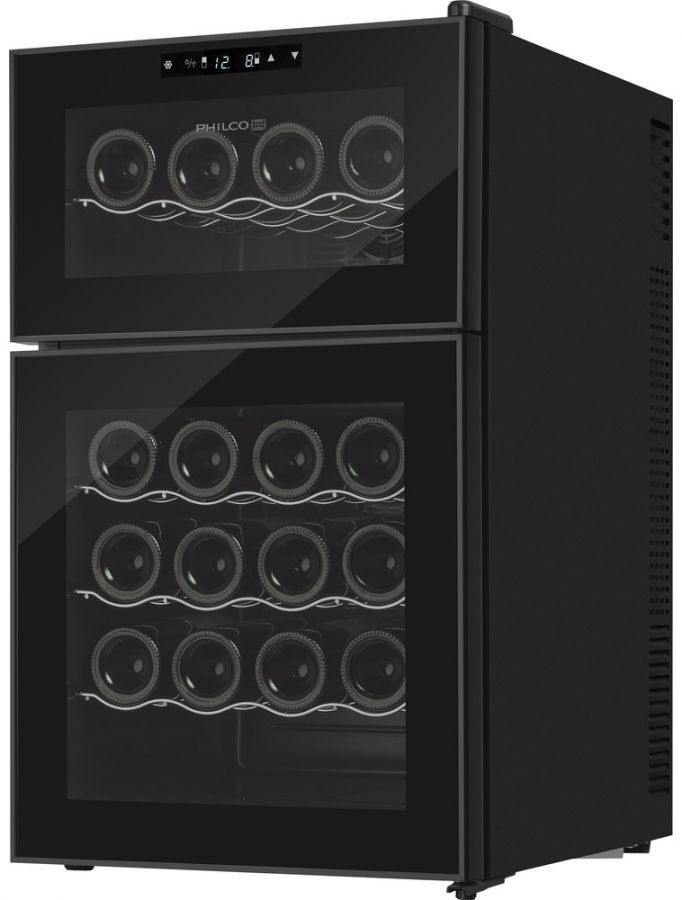 Dvouzónová vinotéka Philco PW24FD s možností naplnění bílého i červeného vína, celkem až 24 lahví vín. Tónované, proti poškrábání odolné sklo dveří, bez rámu se zámkem ovládacího panelu. Víno je uchováno při vlhkosti 50-80 %.